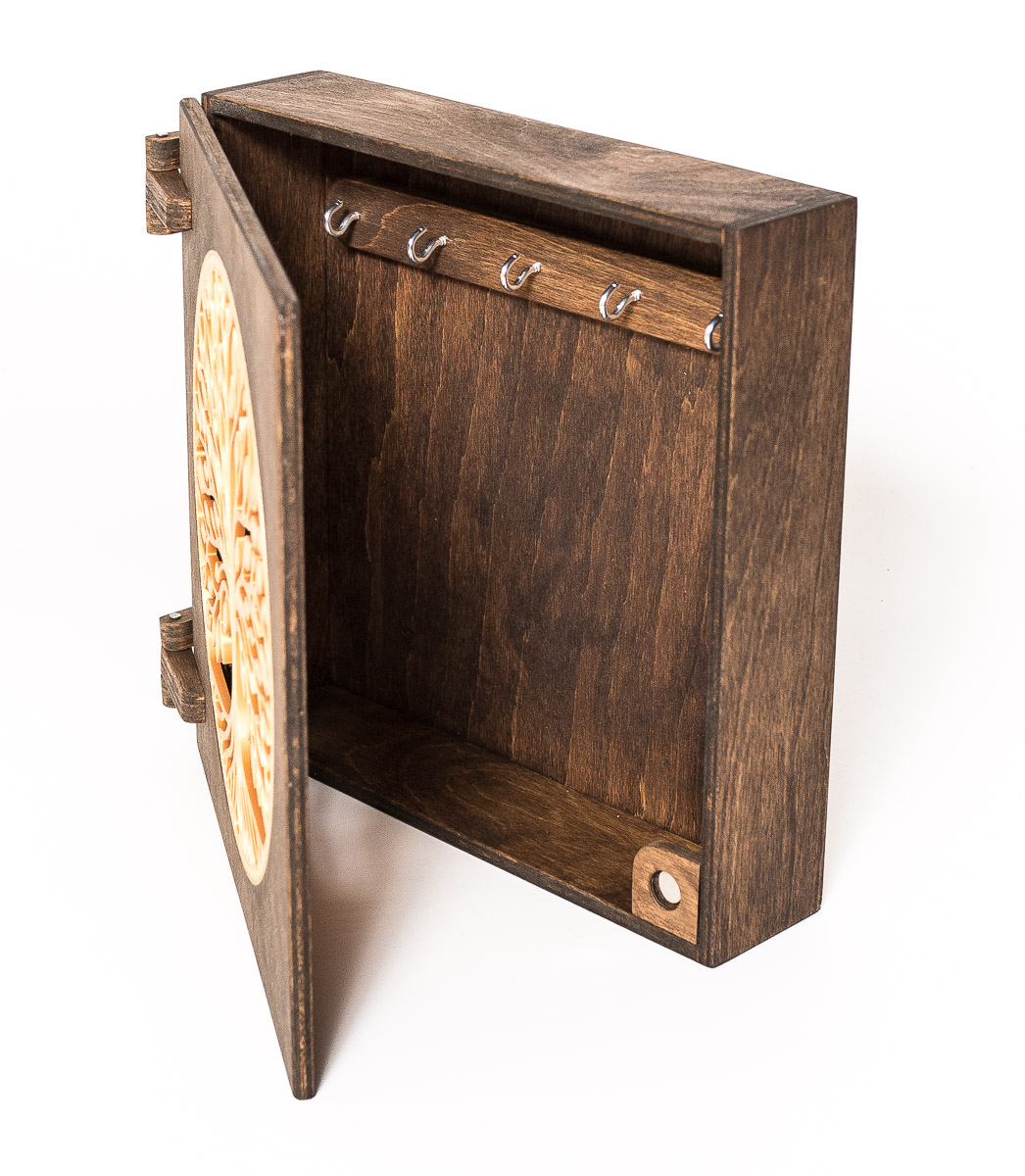 W drzwiczkach prezentowanej szafeczki wykonany został symbol drzewa. Wewnątrz znajduje się pięć haczyków, idealnych do odwieszenia nawet dużych i ciężkich pęków kluczy (na życzenie możemy dołączyć dodatkowy rząd haczyków). Dodatkowo szafka posiada dwa zamocowane magnesy, co zabezpiecza ją przed samoistnym otwieraniem.